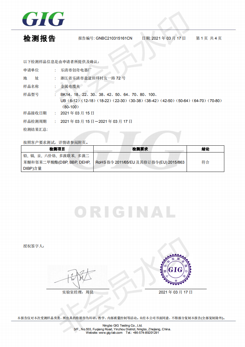 金属电缆夹子环保检测ROHS报告